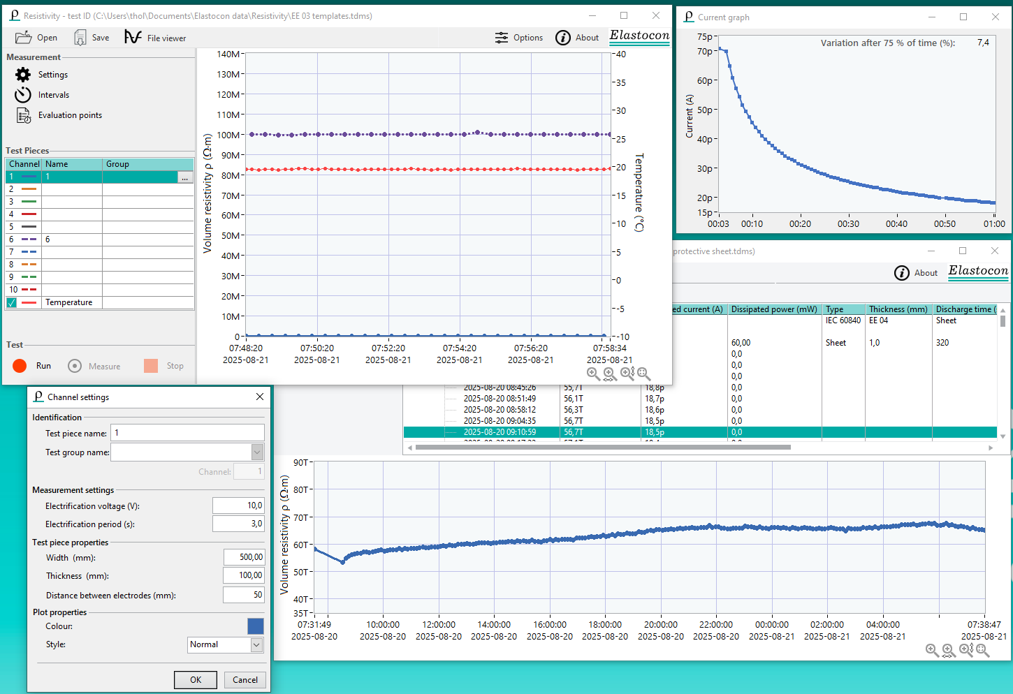 Perform resistivity measurements using test methods defined by industry standards ASTM, ISO and IEC. Analyze current–time plots to determine the proper electrification time for each material and review multiple readings to confirm stable and consistent results. Configure and automate measurements with the EC 14 Resistivity application. Loop or schedule tests to monitor resistivity changes over time, and export results for analysis.